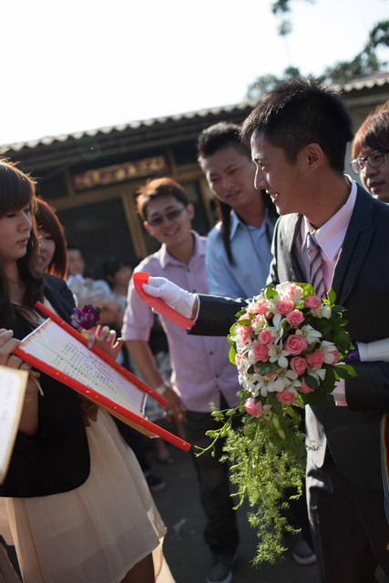 新娘對新郎宣示主權,請新郎銘記在心。請新郎大聲唱出「路邊的野花不要採」,伴郎負責間奏起音。